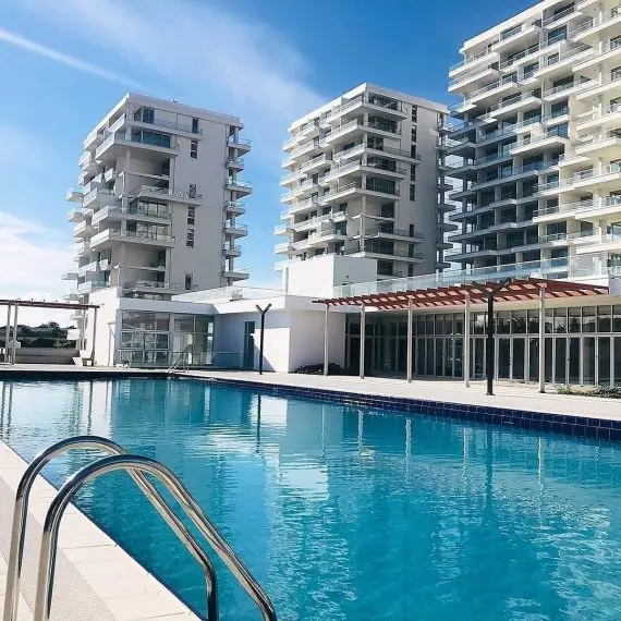 Town Park – these are two 12-storey buildings of modern architecture with a beautiful view of the sea and the city, separated by an outdoor pool, the originally executed facades of buildings stand out favorably against the surrounding buildings. The complex includes apartments with balconies of various sizes and breading: studios from 48 sq. M. m, apartments 1 + 1 from 60 square meters. m and 2 + 1 from 95 square meters. The apartments are handed over to buyers in finished form, the price includes: finishing interior, built-in kitchen of the highest quality, built-in wardrobes in each bedroom, double glazed windows, ceramic or parquet flooring, ceramic finishing of bath and toilet, plumbing. The complex has an excellent modern infrastructure: a central generator, central air conditioning and heating, an outdoor swimming pool, 2 elevators, parking.